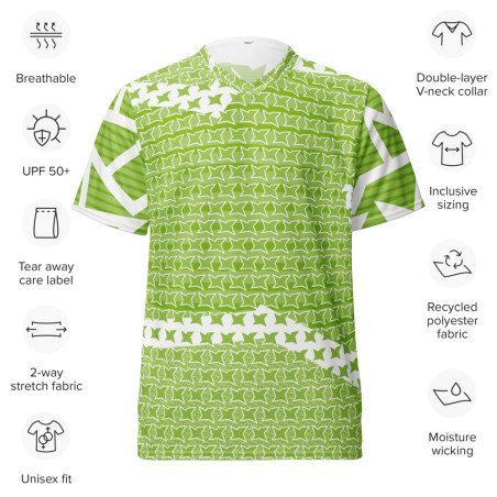 Looking for the perfect sports jersey? We have you covered—made of 100% recycled polyester fabric, this shirt is breathable, moisture-wicking, and has a double-layered v-neck collar that creates a premium look.